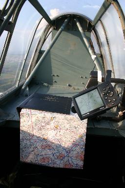 Below a picture of the navigators workspace with Bottlang-Manual, Jeppesen map and handheld GPS as backup. The picture show the view forward, with the armour plate behind the pilots head. Apart from that however the view from the large canopy is just great.