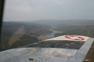 Behind the front we found perfect flying conditions, which made terrestrial navigation much easier. The excavation piles of the potash mines (Kali in German), which are known locally as Kalimandscharos, are good orientation marks in the otherwise quite uniform landscape, as they are marked on the maps and visible over long distances.