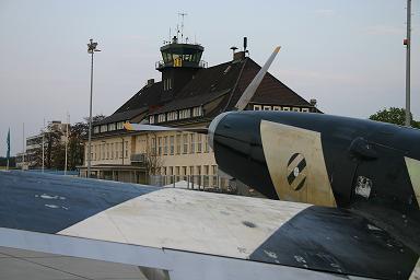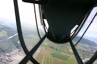I had the opportunity to fly with it as a passenger when it was flown on the 26th June 2004 to the Belpmoostage airshow, celebrating 75 years of Berne-Belp airport. Thanks to our arrival in Berne early in the morning we could rehearse the airshow program, which allowed me to shoot a number of great photos, like the following shot of Berne airport while performing a barrel roll.