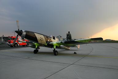 Immediately after reaching the parking position a fire fighting vehicle arrived with blue lights, but not because of any fire. The firefighters just wanted to have a look at the unusual plane, one even asked to have a picture taken of himself sitting in the cockpit.