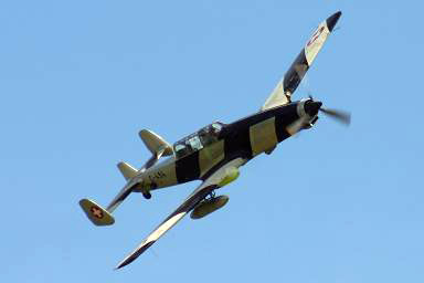 After the war these aircraft were quickly replaced by jets. A small number was however kept in service for target towing. When their Hispano-Suiza 12 cylinder 1000 hp piston engines reached their end of life during the sixties they were replaced with Avco Lycoming T-53 propeller turbines. Due to the much lower weight of the turbines compared to the piston engines the nose of the aircraft had to be extended by 1.5 m to retain the centre of gravity. This, combined with the black and yellow striped paint scheme which was selected for safety reasons, gave the aircraft a unique look. The nickname “flying pedestrian crossing” speaks for itself. The rebuilt aircraft were called C-3605 and remained in service until 1987.